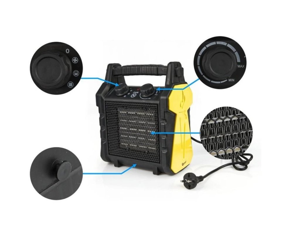 A készülék biztonsági billenéskapcsolóval van ellátva, amely azonnal lekapcsolja az áramellátást, ha a hőlégfúvó véletlenül felborul. A kompakt méret, az alacsony zajszint és a magas hőhatékonyság kényelmes és energiatakarékos használatot biztosít.