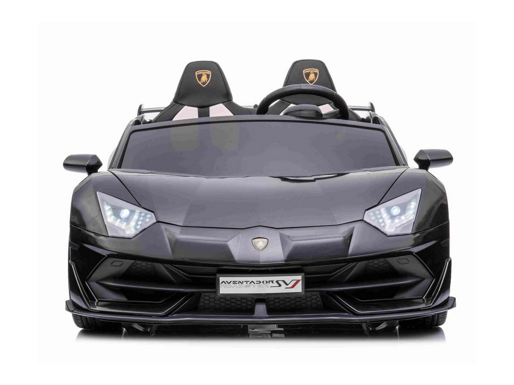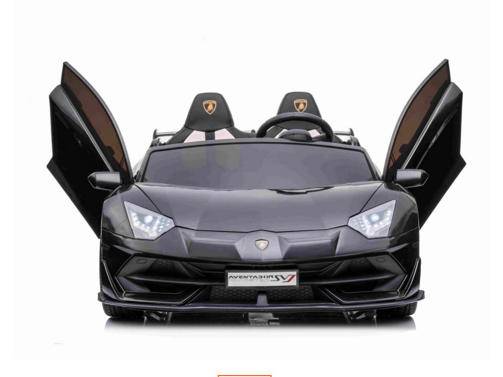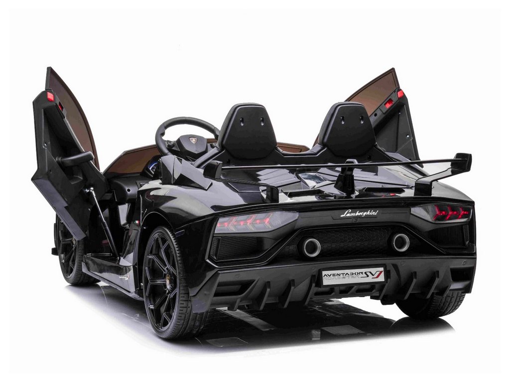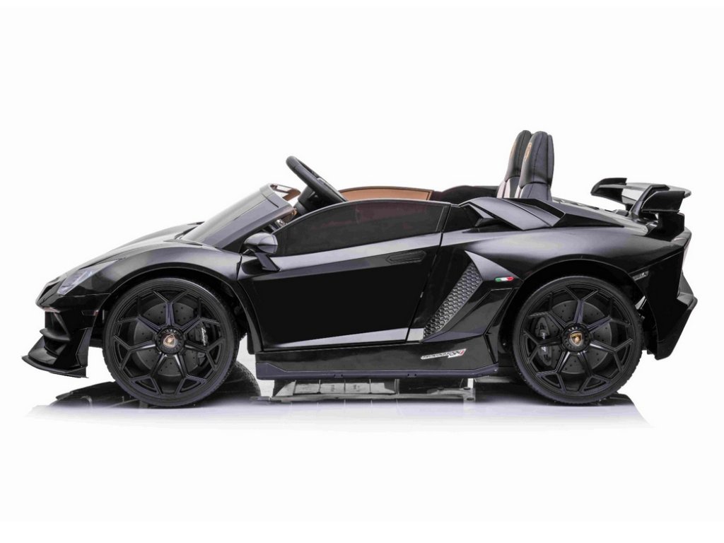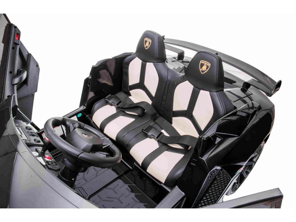 Lamborghini Aventador 24V Kétszemélyes, Fekete fényezés, 2,4 GHz-es távirányító, Puha PU ülések, LCD kijelző, felfüggesztés, függőlegesen nyíló ajtók, Puha EVA kerekek, 2 X 45 W-os MOTOR, EREDETI engedély