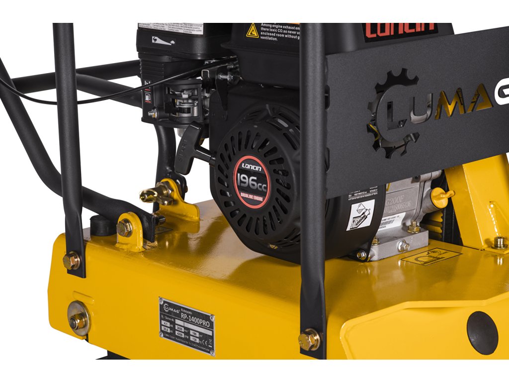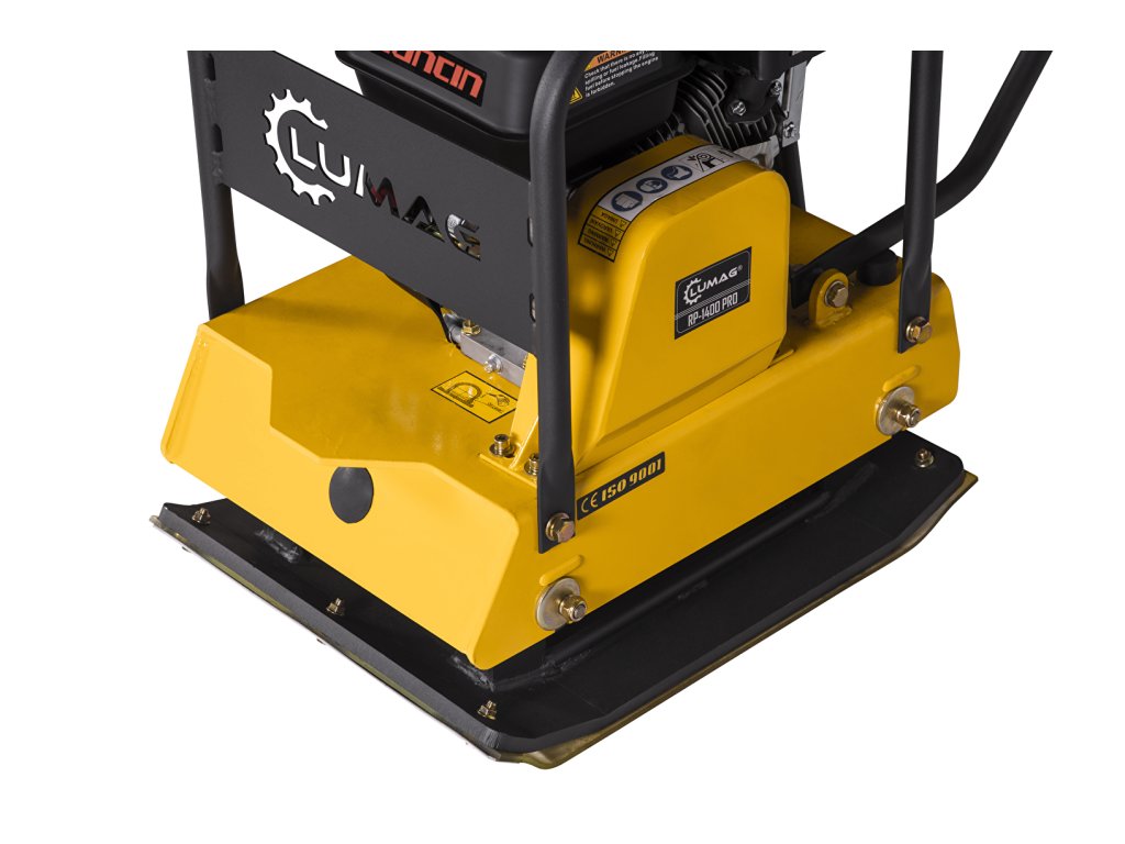 A Lumag RP1400PRO kompakt felépítése és összecsukható fogantyúja megkönnyíti a szállítást a nehezen hozzáférhető helyekre. Az ergonomikus kialakítású fogantyú gumibakkal is fel van szerelve a rezgéscsökkentés érdekében. Ez a gép elektronikus olajszintmérő rendszerrel van felszerelve. Teljesen burkolt ékszíjjal van felszerelve. A 2000 kg-os ütőerő igazán sokoldalúvá teszi ezt a gépet. A speciális "középen elhelyezett" rezgő egység jelentősen megnöveli a munka sebességet.