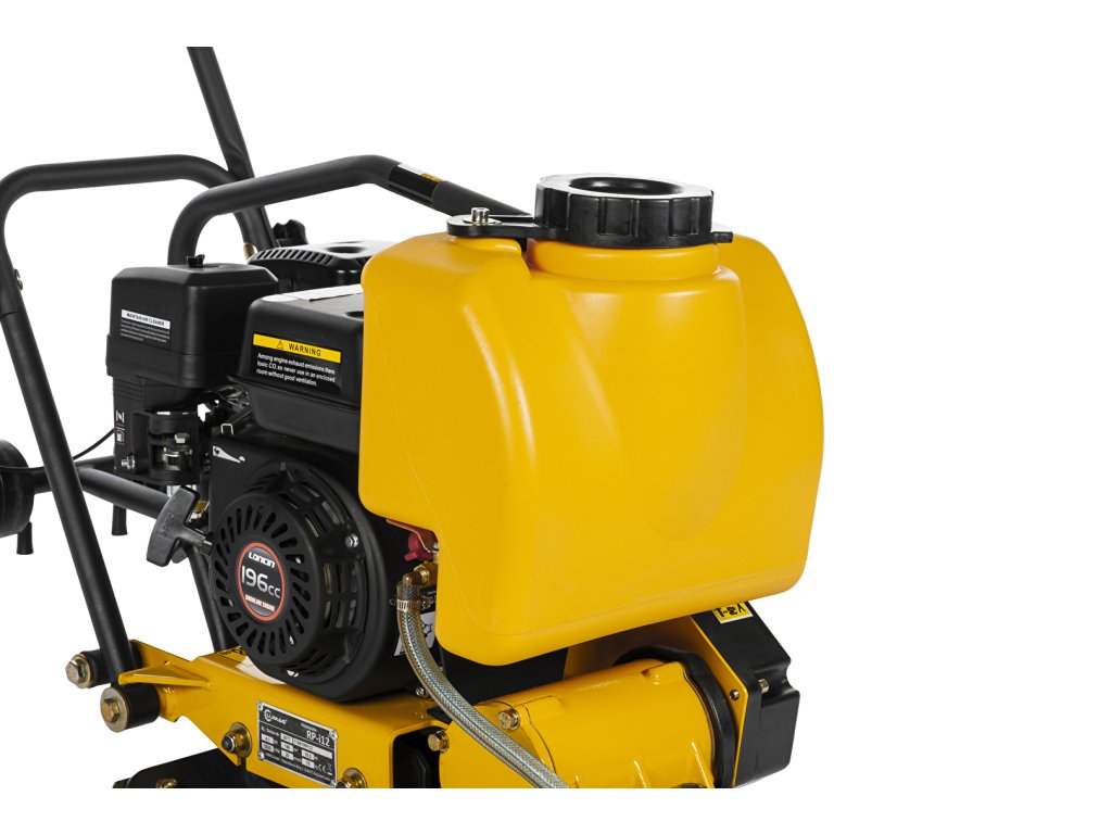 Az ergonomikus kialakítású fogantyú gumibakkal is fel van szerelve a rezgéscsökkentés érdekében. A 10 literes víztartály könnyen megtölthető, és locsolórendszerhez csatlakoztatható az optimális vízelosztás érdekében az alaplemez teljes szélességében. A víz elnyomja a port a száraz aljzatok tömörítésekor, és kiválóan alkalmas hideg és meleg aszfalt tömörítésére. Egy speciális cső osztja el a vizet a lapvibrátor előtt és alatt. A víztartály kivehető, így a lapvibrátor természetesen víztartály nélkül is használható.